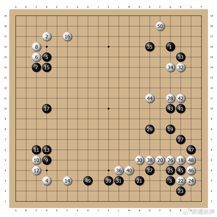 黑21粘上后,黑棋全局厚实,实空也不落后,掌握了主动权。
