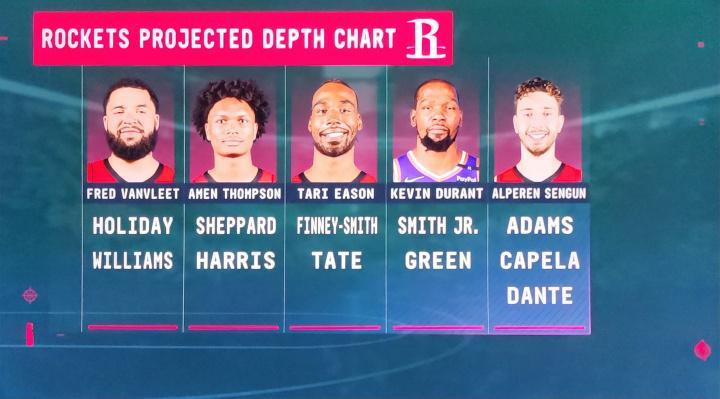 直播吧07月12日讯 今日夏联对阵快船,火箭总经理斯通在现场接受采访时,转播方晒出的火箭阵容深度图:
