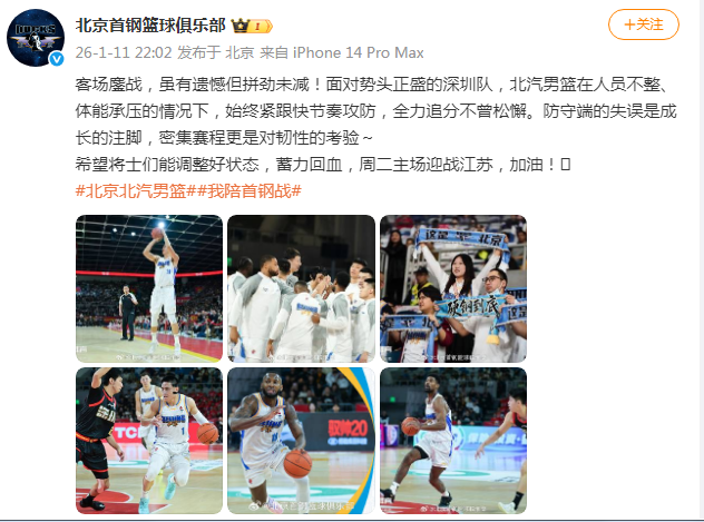 反观北京官微发文总结还是以打气为主:“客场鏖战,虽有遗憾但拼劲未减!面对势头正盛的深圳,北京在人员不整、体能承压的情况下,始终紧跟快节奏攻防,全力追分不曾松懈。防守端的失误是成长的注脚,密集赛程更是对韧性的考验。希望将士们能调整好状态,蓄力回血,周二主场迎战江苏,加油!”